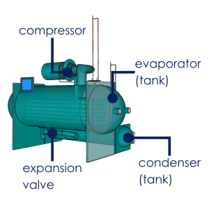 The evaporator uses refrigerant to absorb heat from the building’s water, cooling it down. The compressor increases the pressure and temperature of the refrigerant. The condenser absorbs heat from the refrigerant, and sends this heat outside for rejection. Finally, the expansion valve (often a thermal expansion valve) reduces the refrigerant’s pressure and temperature before it re-enters the evaporator.
